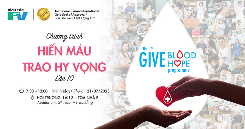 Bệnh viện FV đã sẵn sàng để đón chào các tình nguyện viên, trong đợt hiến máu nhân đạo lần thứ 2 trong năm 2023. Với mong muốn đóng góp cho xã hội, hỗ trợ các bệnh nhân trong điều trị, đồng thời cũng là một truyền thống tốt đẹp trong nhiều năm nay, Bệnh viện FV tiếp tục phối hợp cùng Bệnh viện Truyền máu Huyết học tổ chức chương trình “Hiến máu – Trao hy vọng” lần 10.