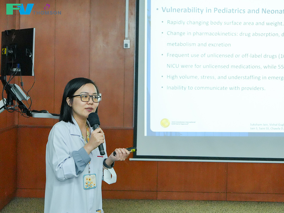 Chuyên đề của Giám sát Dược sĩ lâm sàng – chị Nguyễn Thị Khánh Vân về cách Bệnh viện FV bảo đảm an toàn trong sử dụng thuốc cho trẻ sơ sinh và trẻ nhỏ, cùng phần trình bày của Nữ hộ sinh trưởng – chị Trần Thị Thanh Trang về cách chăm sóc trẻ ở những năm tháng đầu đời, đã mang đến nhiều kiến thức hữu ích cho người tham dự. Các bài nói chuyện không chỉ mang tính chuyên môn cao mà còn gợi mở cách tiếp cận mới trong phối hợp đa chuyên khoa, kết nối chặt chẽ giữa bác sĩ, điều dưỡng, phụ huynh và cộng đồng để bảo vệ an toàn cho trẻ.